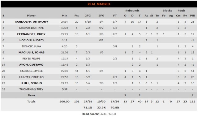 La baja participación de Doncic que solo ha jugado 4 minutos. Parece que Laso intenta «protegerle» de todo el ruido exterior. Si es así, nada que objetar.