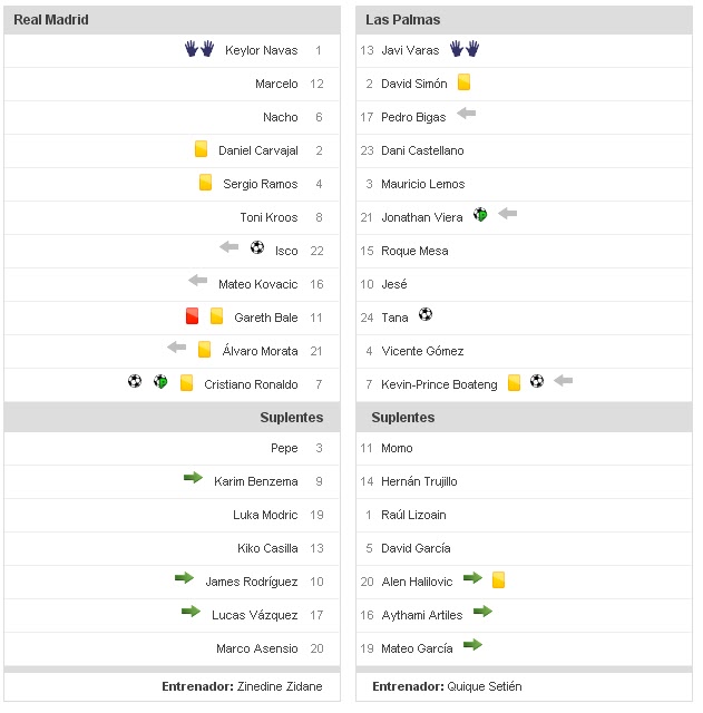 Goles de Isco y Cristiano Ronaldo (2, uno de penalti) para los nuestros. Los de Las Palmas obra de Tana, Viera (penalti) y Boateng.