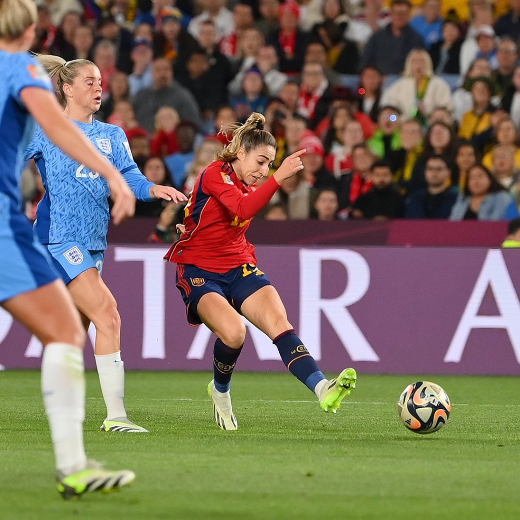 Control de Mariona y Olga ya está alcanzando a la defensora inglesa. Primer toque de la mallorquina, y Olga ya está la altura de su par. Segundo toque y la sevillana ya ha dejado atrás a la inglesa. Tercer toque de Mariona, y ya están las dos en paralelo. Con el cuarto envía el balón en profundidad para la sevillana, medido y a la velocidad y con la cadencia perfectas.