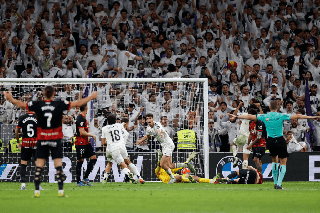 El córner, pues qué quieres que te diga… tienes a un tío de 2 metros en el punto de penalti y vas y lo sacas al primer palo. Porque sí, porque tú lo vales. Y porque, qué carallo, esto el Real Madrid … o lo hacemos difícil o no se hace. Coñio ya, hombre. Que nada más que os gustan los goles por la escuadra desde fuera del área o los que acaban al fondo de las mallas después de que Vini o Kylian se hayan regateado al todo el equipo contrario y parte del propio.